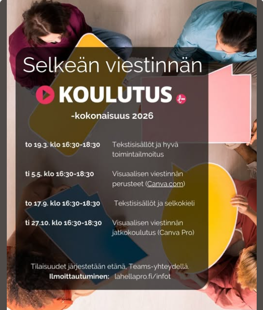 ke 7.5.2025 klo 16.30-18.30 Visuaalisen viestinnän perusteet maksuton koulutus Teams- etäyhteydellä. Koulutuksessa perehdytään graafisen viestinnän ja Canva.com ohjelman perusteisiin. Koulutuksessa…