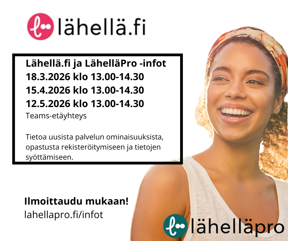 Lähellä.fi-info 1.4.2025 klo 17.00-18.30 Ilmoittaudu maksuttomaan Lähellä.fi-infoon! Infossa esitellään Lähellä.fi-palvelua ja käydään läpi rekisteröityminen ja toiminnan ilmoittaminen.…