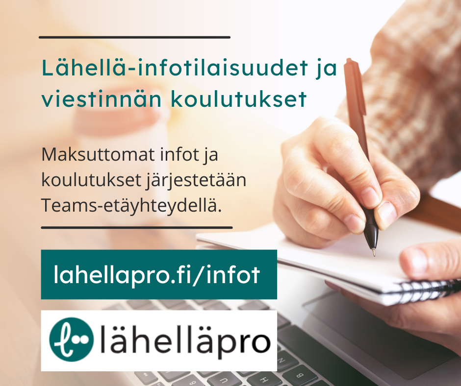Lähellä-infotilaisuudet toteutuvat kuukausittain Teams-etäyhteydellä. Koulutukset viestinnän tueksi syys- ja lokakuussa. Ilmoittautumiset ja lisätiedot verkkosivuilta Lähellä.fi | Lähellä.fi-infot ja…